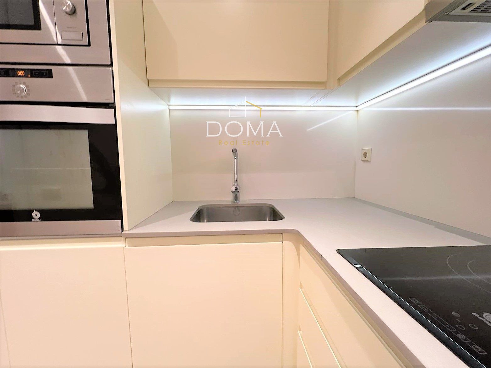 La cocina, moderna y completamente equipada con electrodomésticos empotrados, se integra perfectamente en el espacio, ofreciendo funcionalidad y diseño.