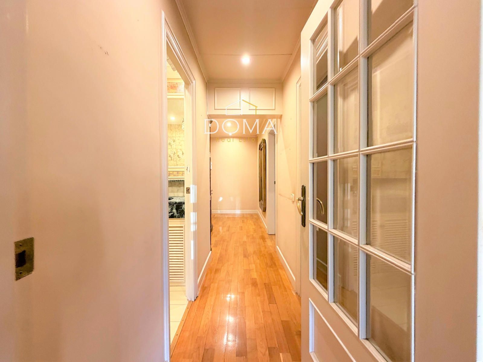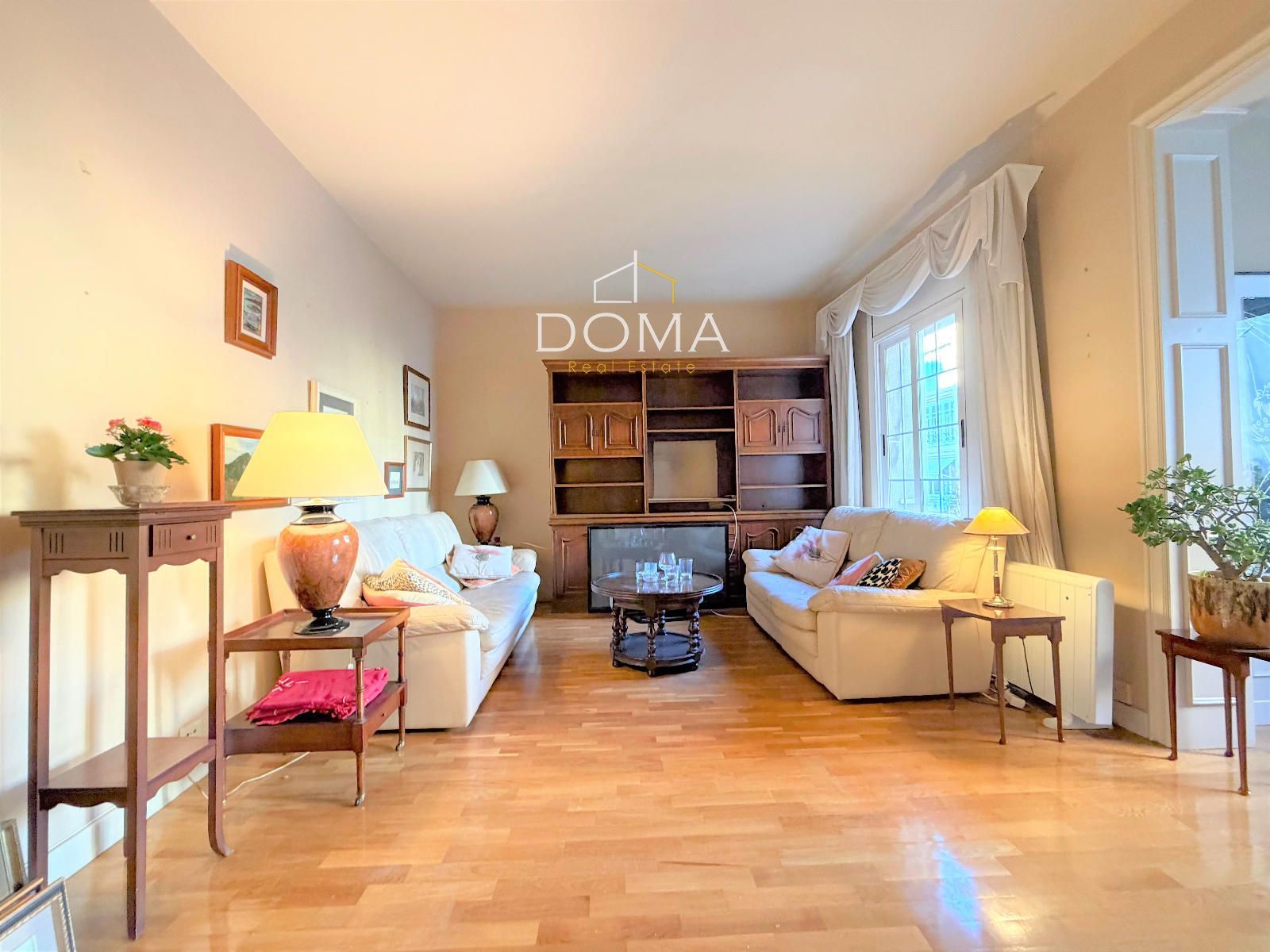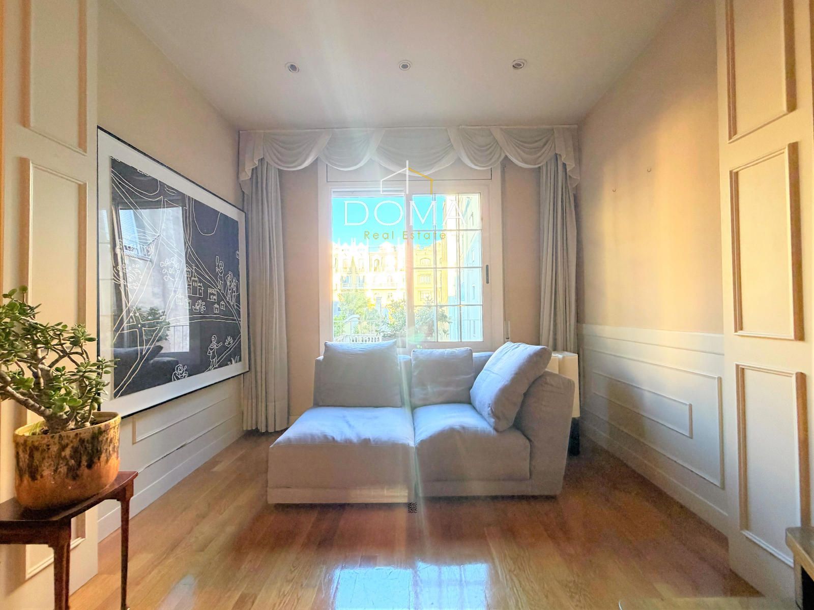 Avanzando llegamos al corazón de la vivienda: un salón-comedor de 28m², muy luminoso y con acceso a una zona acristalada que aporta profundidad y amplitud visual. Desde aquí se disfrutan unas vistas espectaculares a un precioso patio de manzana, lleno de vegetación y con una singular casa modernista que convierte la perspectiva en un auténtico privilegio urbano.